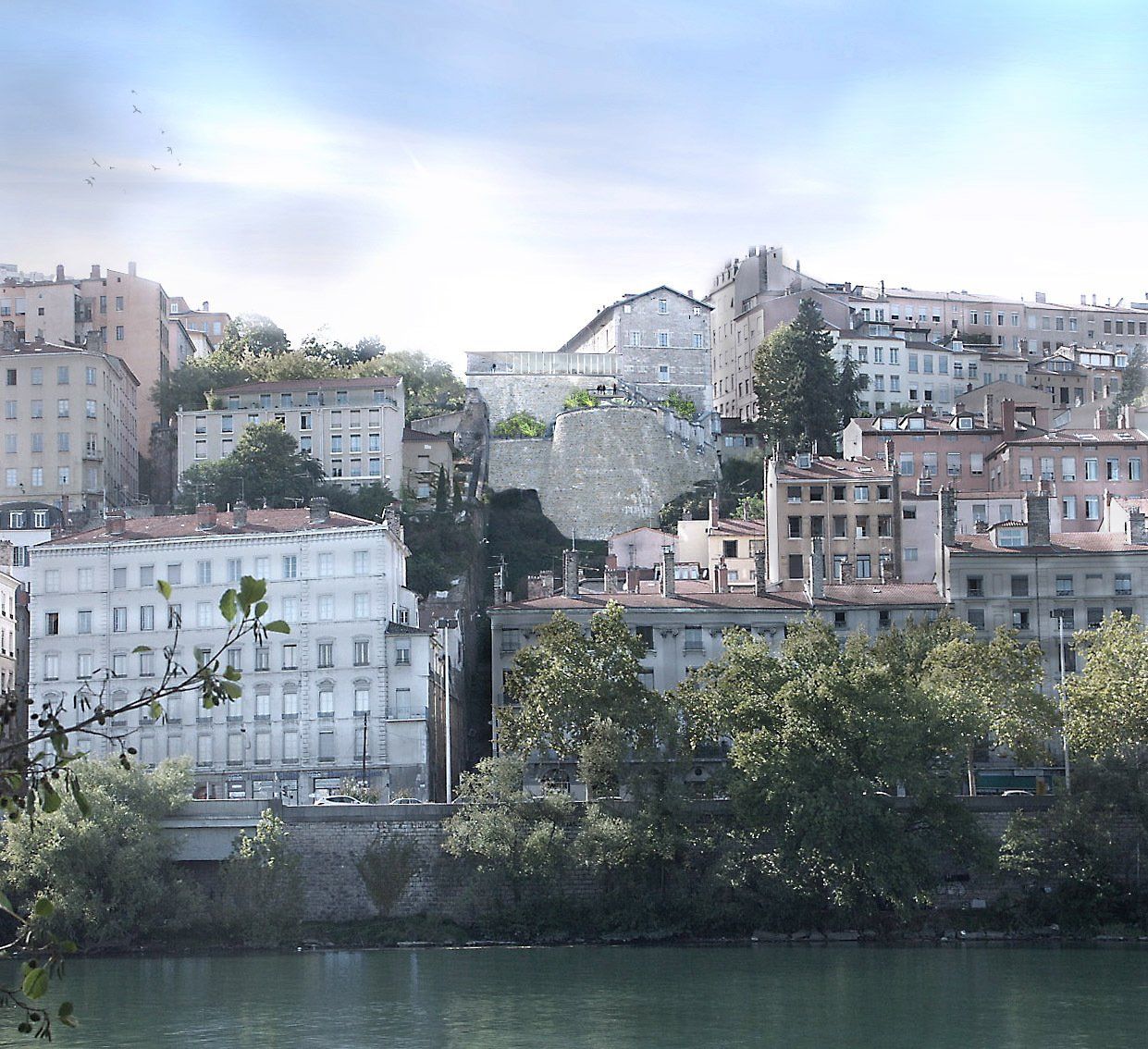 Le Fort Saint Laurent situé dans le prolongement du boulevard de la croix Rousse domine le Rhône et faisait à l’origine partie de la muraille Saint Sébastien. Ouvrage défensif, celui-ci est aujourd’hui relativement hermétique. Une des premières intentions fut d’ouvrir les larges portes du mur d’enceinte afin de rendre publique la cour intérieure, le rez-de-chaussée du bâtiment principal ainsi que les terrasses situées au niveau du bastion en contrebas. Idéalement située à proximité du boulevard de la Croix Rousse et en continuité avec la place Bellevue, la cour est un espace plus intime qui permet d’accéder aux différents espaces du fort Saint Laurent. A l’intérieur du bâtiment principal on retrouve la boulangerie et les cuves de fermentation au RDC, dans les étages inférieurs la torréfaction ainsi qu’une large terrasse orientée à l’Est permettant de prendre le café en matinée. L’intervention architecturale se veut quant à elle discrète; seul un volume vitré se pose sur le mur de fortification afin d’offrir aux visiteurs une vue privilégiée sur l’est Lyonnais.