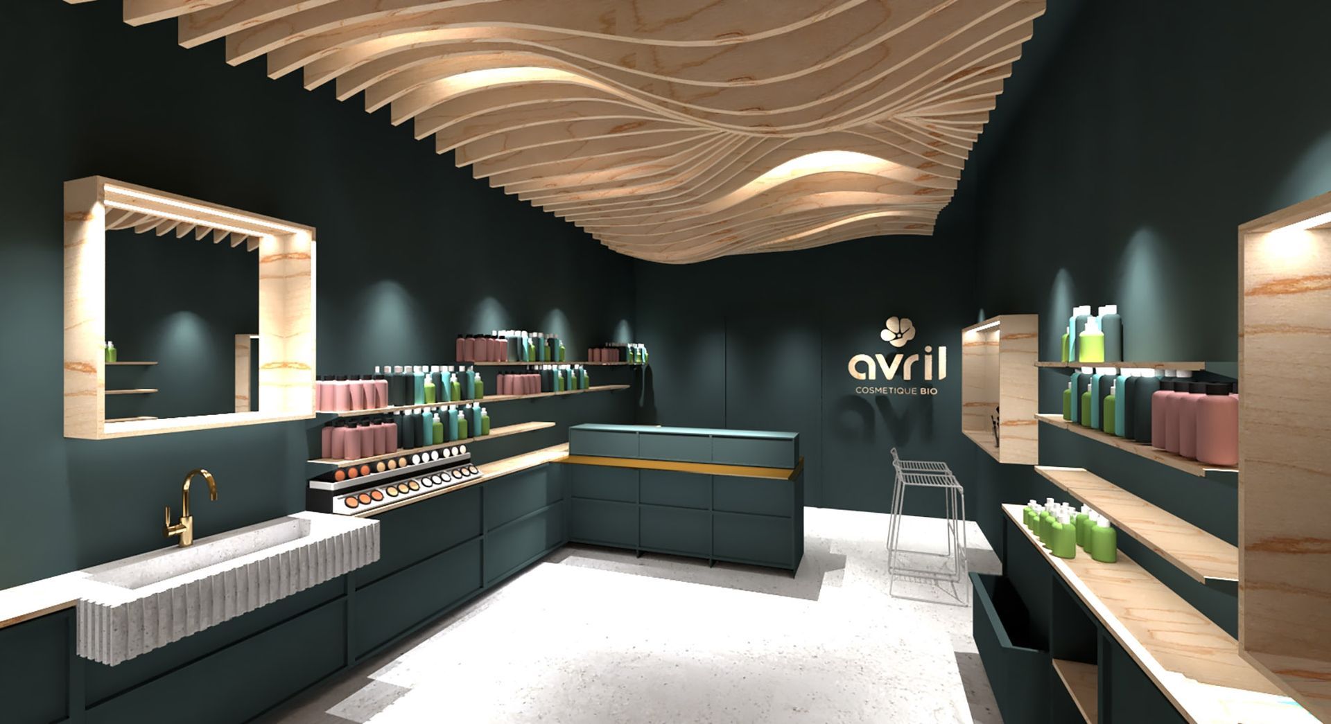 Dans le centre commercial Part Dieu à Lyon, un spectaculaire plafond en bois ondule sur toute la profondeur de la boutique et nous invite à explorer les lieux. Les meubles clairs aux lignes rectilignes affichent quant à eux une relative sobriété qui contraste avec les lignes dynamiques du plafond. En arrière-plan, les murs ocres soulignent l’image de qualité de la marque et met en valeur ses packagings pastels.