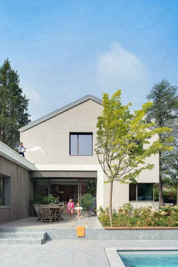 Le projet intègre en son cœur un patio qui vient rompre l’échelle du bâtiment. Cet espace permet d’y associer des pièces traversantes en lien direct avec l’extérieur. En rez-de-jardin, la salle de jeux des enfants peut ainsi doubler en surface. Dès que l’on ouvre les larges baies vitrées, à l’étage on circule également autour de ce patio qui devient un lieu de convivialité et offre un véritable paysage intérieur qui évolue au fil des saisons.
